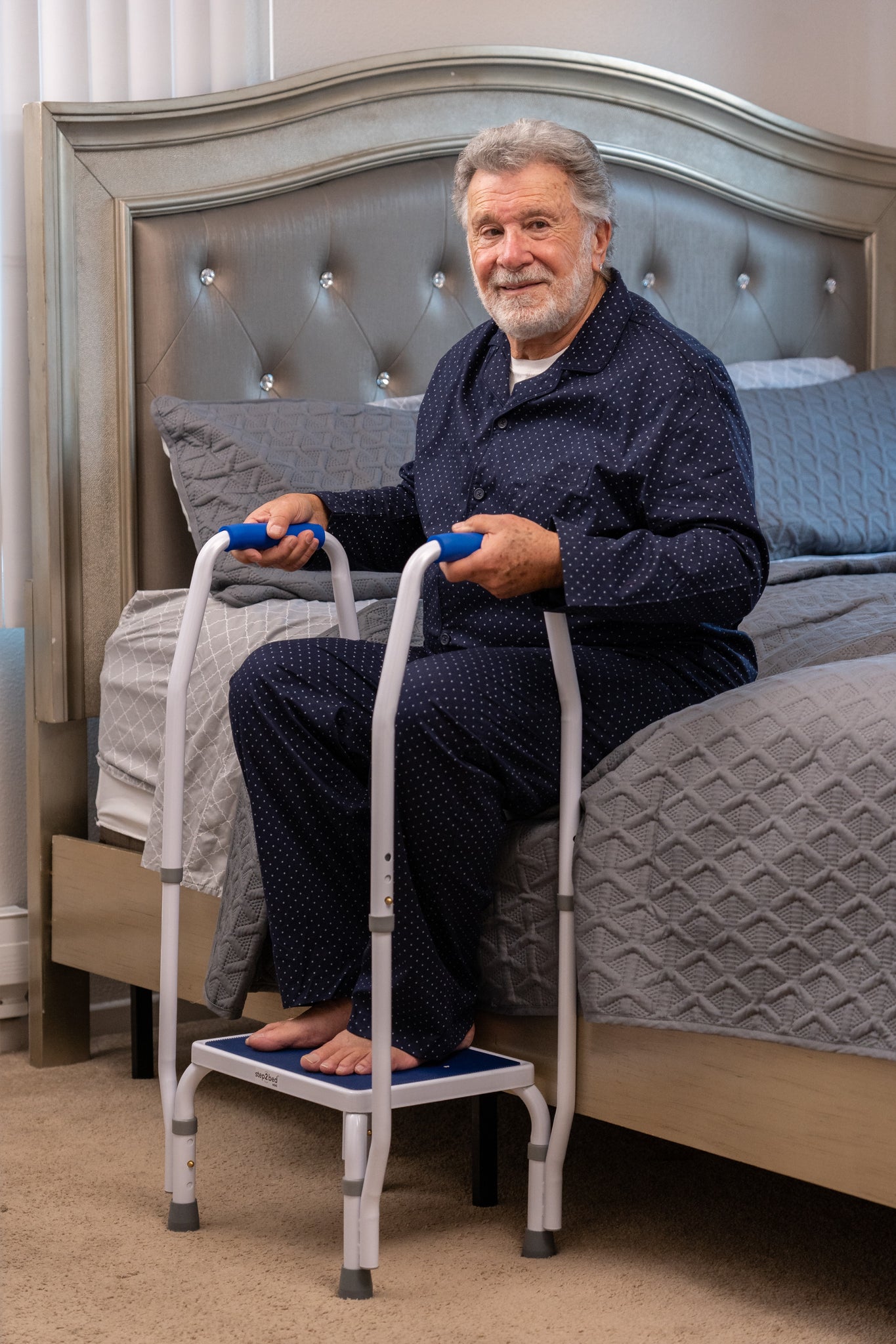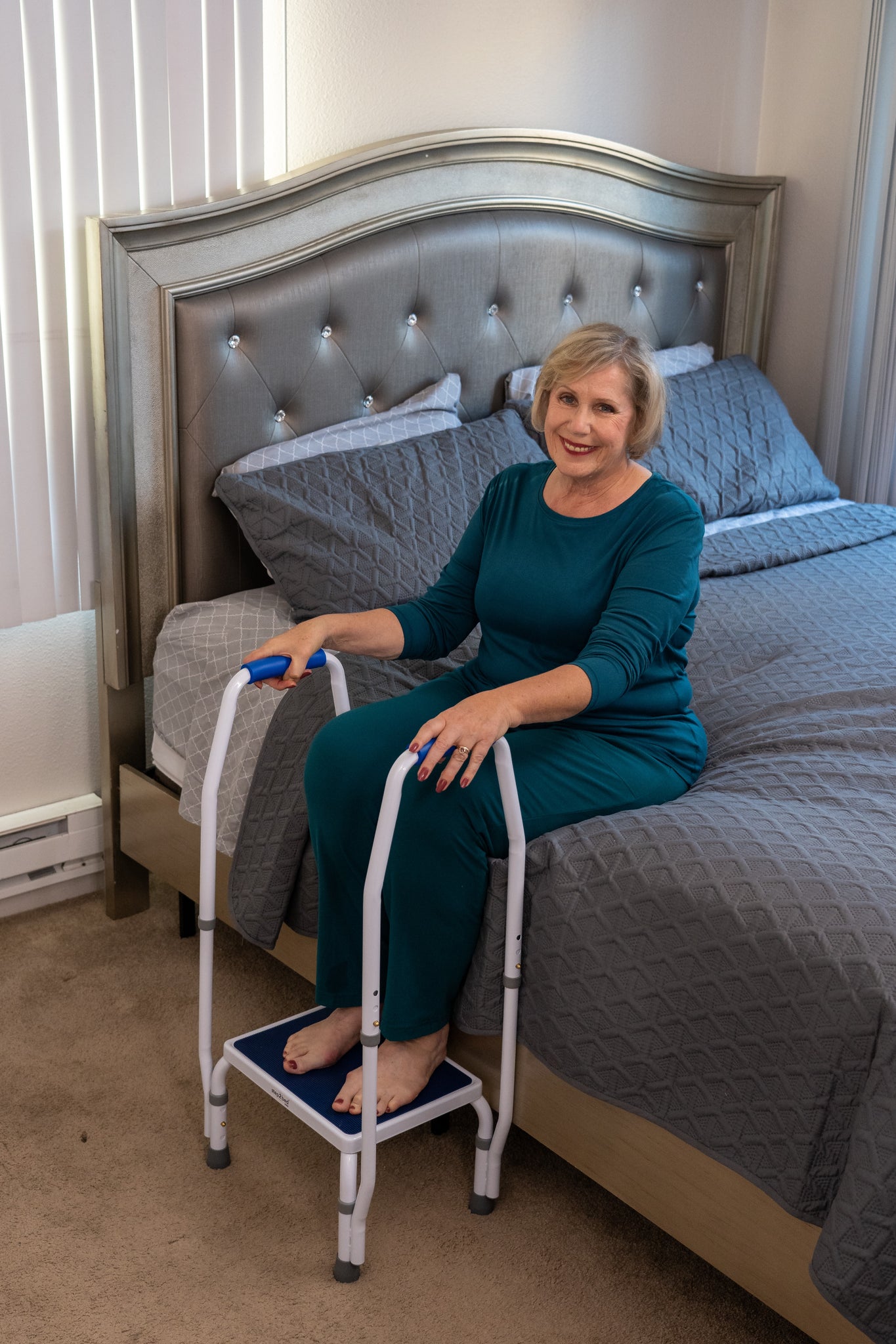 Offers Support as a Bed Rail: The step2bed mini encompasses unique features that make it an excellent elderly bed rail option. Along with providing a safe pathway to get in and out of bed safely, it offers two perpendicular handrails and an adjustable step that shortens the distance from the bed to the floor.